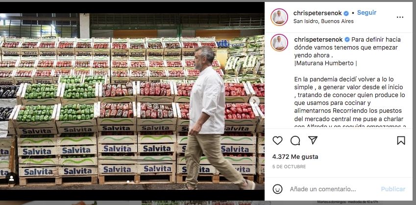 En el texto de su posteo, el chef dijo: “Decidí volver a lo lo simple a generar valor desde el inicio, tratando de conocer quién produce lo que usamos para cocinar y alimentarnos Recorriendo los puestos del mercado central me puse a charlar con Alfredo y en seguida empezamos a trabajar juntos, después descubrí que detrás de él estaba @salvitaalimentos una empresa maravillosa con un compromiso único”.