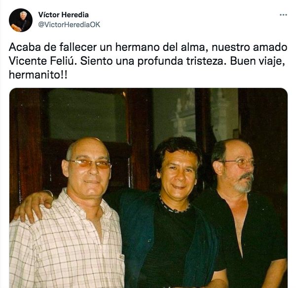 Tras las repercusiones de la triste noticia, aparecieron nuevos testimonios de diversos colegas: "Acaba de fallecer un hermano del alma, nuestro amado Vicente Feliú. Siento una profunda tristeza. Buen viaje, hermanito!", escribió Víctor Heredia en sus redes sociales.