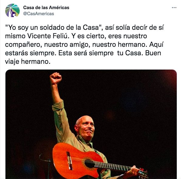 "‘Yo soy un soldado de la Casa’, así solía decir de sí mismo Vicente Feliú. Y es cierto, eres nuestro compañero, nuestro amigo, nuestro hermano. Aquí estarás siempre. Esta será siempre tu Casa. Buen viaje hermano", compartieron desde la Casa de las Américas en Twitter.