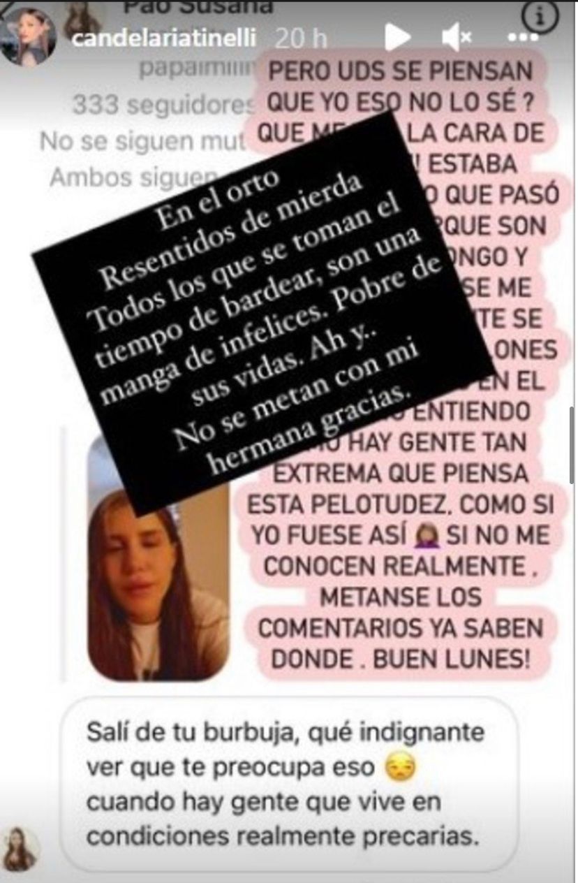 "En el orto. Resentidos de mierda todos los que se toman el tiempo de bardear, son una manga de infelices. Pobre de sus vidas. Ah, y no se metan con mi hermana, gracias”, escribió la cantante en su cuenta de Instagram.