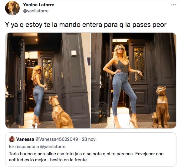 Enterada, la angelita le respondió fiel a su estilo. "Ya que estoy te la mando entera para que la pases peor", expresó la rubia y compartió la imagen completa en su cuenta de Twitter, que hoy tiene en su perfil.