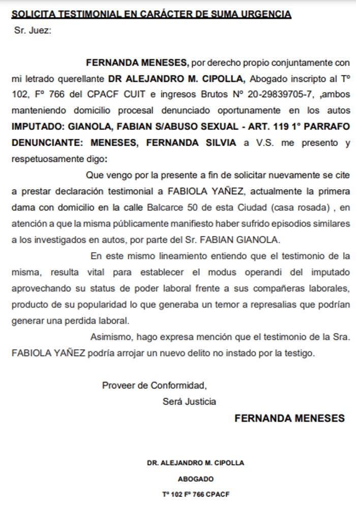 Uno de los casos más resonantes en esta polémica es el de la actriz Fernanda Meneses, quien presentó una denuncia penal contra su colega en 2018 luego de haber trabajado juntos en un programa televisivo de humor. Y ahora, el abogado Alejandro Cipolla, que representa a la artista, solicita que Fabiola Yañez declare en la Justicia en la causa contra Fabián Gianola.