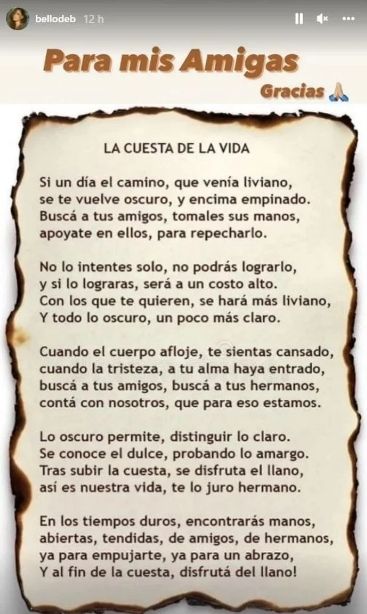 "Cuando el cuerpo afloje, te sientas cansado, cuando la tristeza a tu alma haya entrado, buscá a tus amigos, a tus hermanos, contá con nosotros que para eso estamos. En los tiempos duros encontrarás manos abiertas, tendidas, de amigos y hermanos, para empujarte, darte un abrazo; al final de la cuesta disfrutá del llano. Para mis amigas, GRACIAS", finalizó.