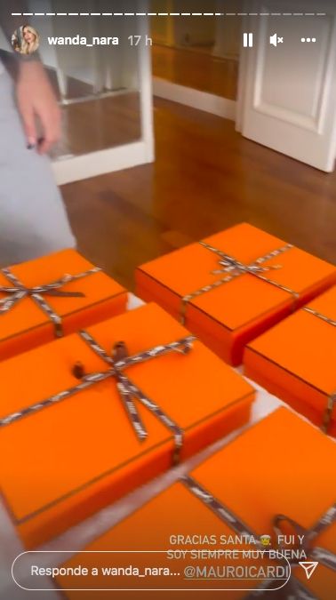 Pasada la medianoche, Wanda recibió un costos regalo de parte de su esposo, Mauro Icardi, quien la agasajó con seis paquetes que contenían productos de la marca favorita de ella: Hermès. Feliz, la mediática compartió en sus redes sociales un video donde se pueden ver las cajas color naranja con detalles en negro, el packaging de la reconocida firma.