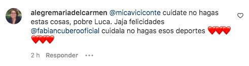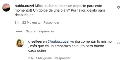 "Mica, cuídate, no es un deporte para este momento!! Un golpe de una ola y? Por favor, dejalo para después", comentó un usuario. "Yo iba comentar lo mismo , más que es un embarazo chiquito pero bueno cada quien", expresó otra seguidora.