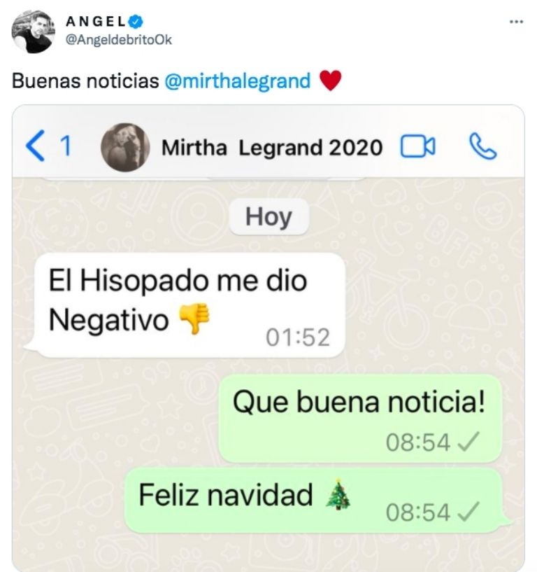 Finalmente, este viernes, Mirtha reveló cuál fue el resultado del hisopado que se hizo ayer: "Me dio negativo", le contó la diva a Ángel de Brito, quien compartió la feliz noticia a través de Twitter.