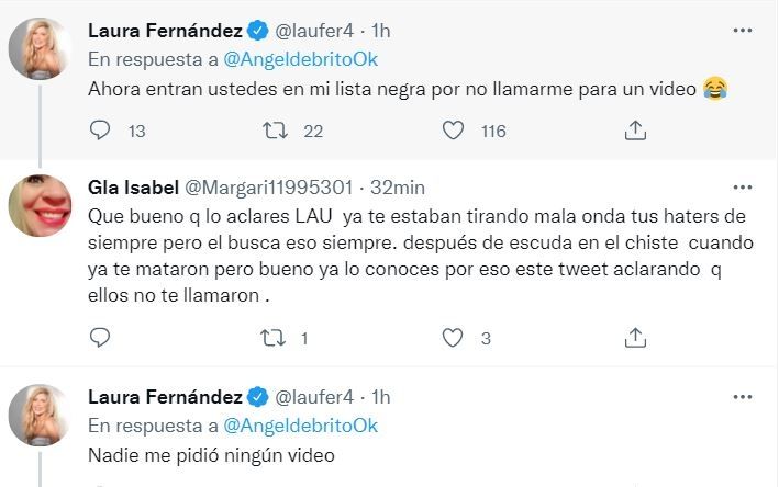 Al ver este escrache en redes Laurita, que es súper amiga suya, no se quedó callada y se la devolvió. “Ahora entran ustedes en mi lista negra por no llamarme para un video”, se defendió la ex de Nicolás Cabré, aunque sumó una carita de llanto de risa. Y para que no queden dudas, luego Lauri volvió a aclarar, indignada, que no tuvo ni noticias de parte de la producción: “Nadie me pidió un video”.