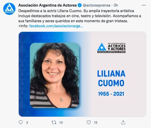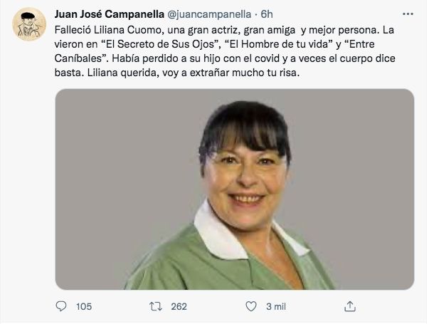"Falleció Liliana Cuomo, una gran actriz, gran amiga y mejor persona. La vieron en El Secreto de sus Ojos, El Hombre de tu vida y Entre Caníbales. Había perdido a su hijo con el Covid y a veces el cuerpo dice basta. Liliana querida, voy a extrañar mucho tu risa", expresó en sus redes sociales el director Juan José Campanella.