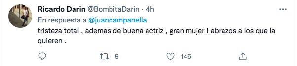 Tras las repercusiones de la triste noticia, Ricardo Darín también se sumó a los mensajes de despedida. "Tristeza total, además de buena actriz , ¡gran mujer! Abrazos a los que la quieren", escribió en la misma red social. Además, la Asociación Argentina de Actores también se hizo eco de su muerte enviando sus condolencias a familiares y amigos.