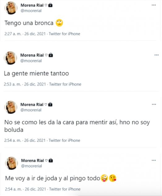 Morena Rial continúa dando de qué hablar con cada publicación que hace en sus redes sociales. Esta vez no tuvo que ver con las diversas cirugías que se realizó, sino con los furiosos mensajes que publicó en la madrugada de este domingo 26 de diciembre.