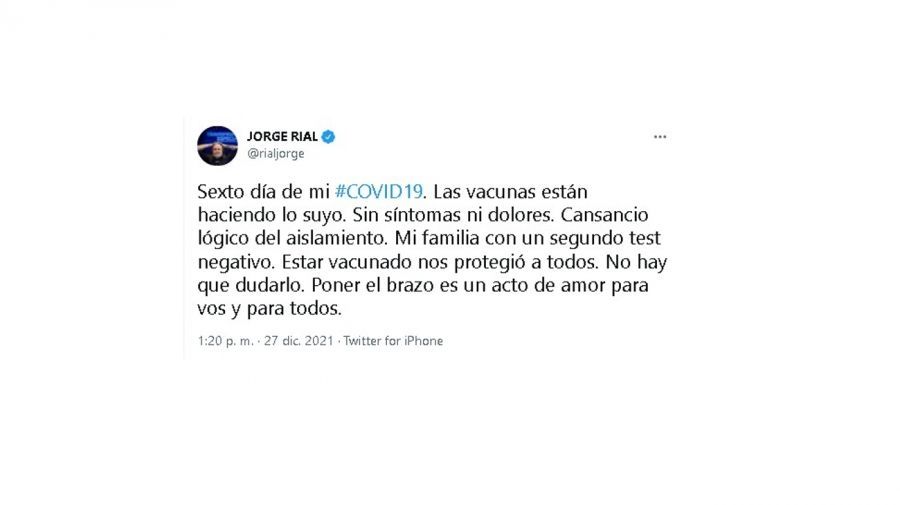 El 22 de diciembre, Jorge Rial había informado a través de las redes sociales que el resultado de su test de coronavirus había sido positivo. "Como muchos, pensé que el virus ya no me iba a alcanzar. Pero el Covid-19 no hace excepciones. Gracias a que estoy con vacunación completa transito con síntomas leves la enfermedad. La falta de olfato fue el alerta. ¡Por eso, sigan cuidándose y vacúnense! Por ustedes y los demás". En esos días, el periodista le expresó a un colega una desconsolada frase mientras transita aislado su cuadro.