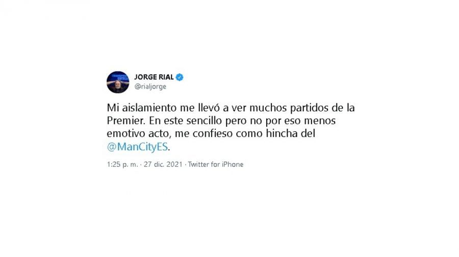 Luego, en un tono más distendido el conductor agregó: “Mi aislamiento me llevó a ver muchos partidos de la Premier. En este sencillo pero no por eso menos emotivo acto, me confieso como hincha del @ManCityES (Manchester City)”.