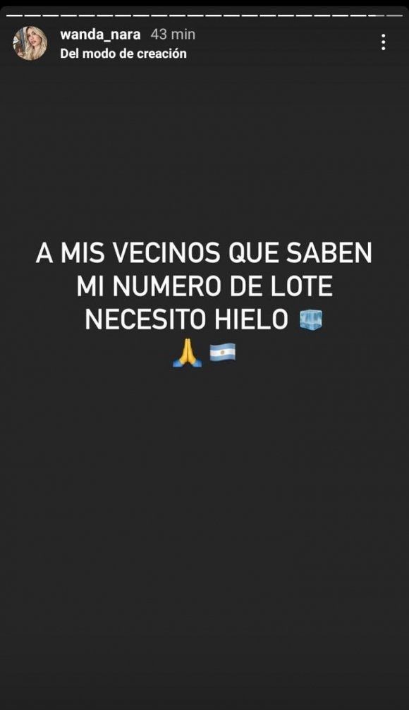 “A mis vecinos que saben mi número de lote, necesito hielo”, escribió Wanda Nara en sus historias de Instagram dejando en evidencia que se olvidó de ese detalle.