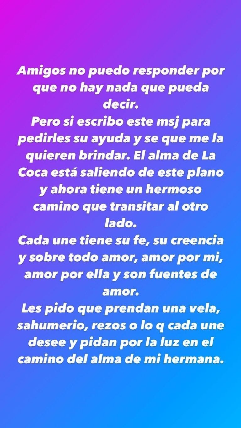 "Amigos no puedo responder porque no hay nada que pueda decir. Pero sí escribo este mensaje para pedirles su ayuda y sé que me la quieren brindar. El alma de la Coca está saliendo de este plano y ahora tiene un hermoso camino que transitar al otro lado. Cada uno tiene su fe, su creencia y sobre todo amor, amor por mí, amor por ella, y son fuentes de amor. Les pido que prendan una vela, sahumerio, rezos o lo que cada uno desee y pidan por la luz en el camino del alma de mi hermana", expresó Gabo Usandivaras a través de una historia de Instagram.