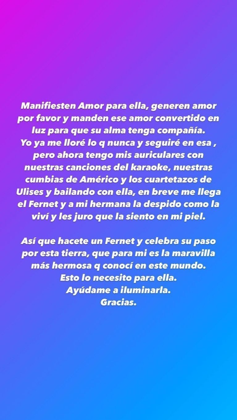 Luego, en otro posteo agregó: "Manifiesten amor para ella, generen amor por favor. Y manden ese amor convertido en luz para que su alma tenga compañía. Yo ya me lloré lo que nunca y seguiré en esa. Pero ahora tengo mis auriculares con nuestras canciones del karaoke, nuestras cumbias de Américo y los cuartetos de Ulises Bueno. En breve me llega el fernet, y a mí hermana la despido como la viví. Y les juro que la siento en mi piel. Así que hacete un fernet y celebrá su paso por esta tierra. Que para mí es la maravilla más hermosa que conocí en este mundo. Esto lo necesito para ella. Ayudame a iluminarla. Gracias".