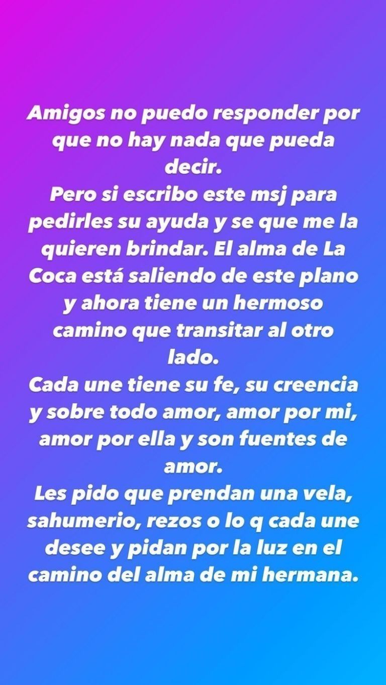 "No puedo responder porque no hay nada que pueda decir. Pero sí escribo este mensaje para pedirles su ayuda y sé que me la quieren brindar. El alma de la Coca está saliendo de este plano y ahora tiene un hermoso camino que transitar al otro lado”, comenzó escribiendo Usandivaras en sus historias de Instagram.