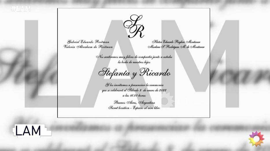 “Se viene una boda donde va a haber muchos famosos, estamos hablando de la de Ricky y Stefi Roitman. Ricky Montaner, el hijo de Ricardo y Stefi Roitman, Stefanía dice la invitación, Stefanía y Ricardo. Nos sentiremos muy felices de compartir junto a ustedes la boda de nuestros hijos, anuncian los padres, que están mencionados también desde la tarjeta”, dijo Ángel de Brito.