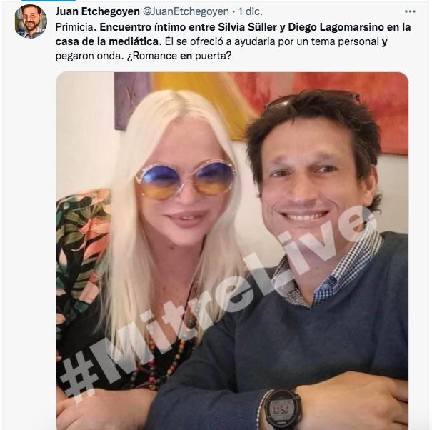 Recordemos que el pasado 1 de diciembre se filtró una imagen de ellos juntos y los rumores de romance no se hicieron esperar. "Encuentro íntimo entre Silvia Süller y Diego Lagomarsino en la casa de la mediática. Él se ofreció a ayudarla por un tema personal y pegaron onda. ¿Romance en puerta?", escribió el periodista Juan Etchegoyen en su cuenta de Twitter.