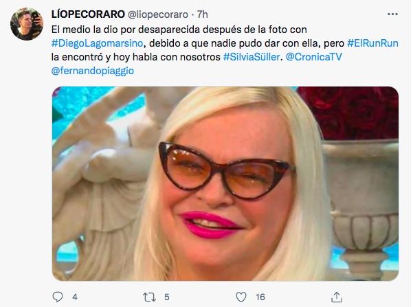 Horas más tarde seguía sin conocerse el paradero de la ex vedette, despertando preocupación entre sus seguidores. Allí fue cuando Lío Pecoraro publicó en su cuenta de Twitter: "El medio la dio por desaparecida después de la foto con #DiegoLagomarsino, debido a que nadie pudo dar con ella, pero #ElRunRun la encontró y hoy habla con nosotros #SilviaSüller. @CronicaTV @fernandopiaggio".