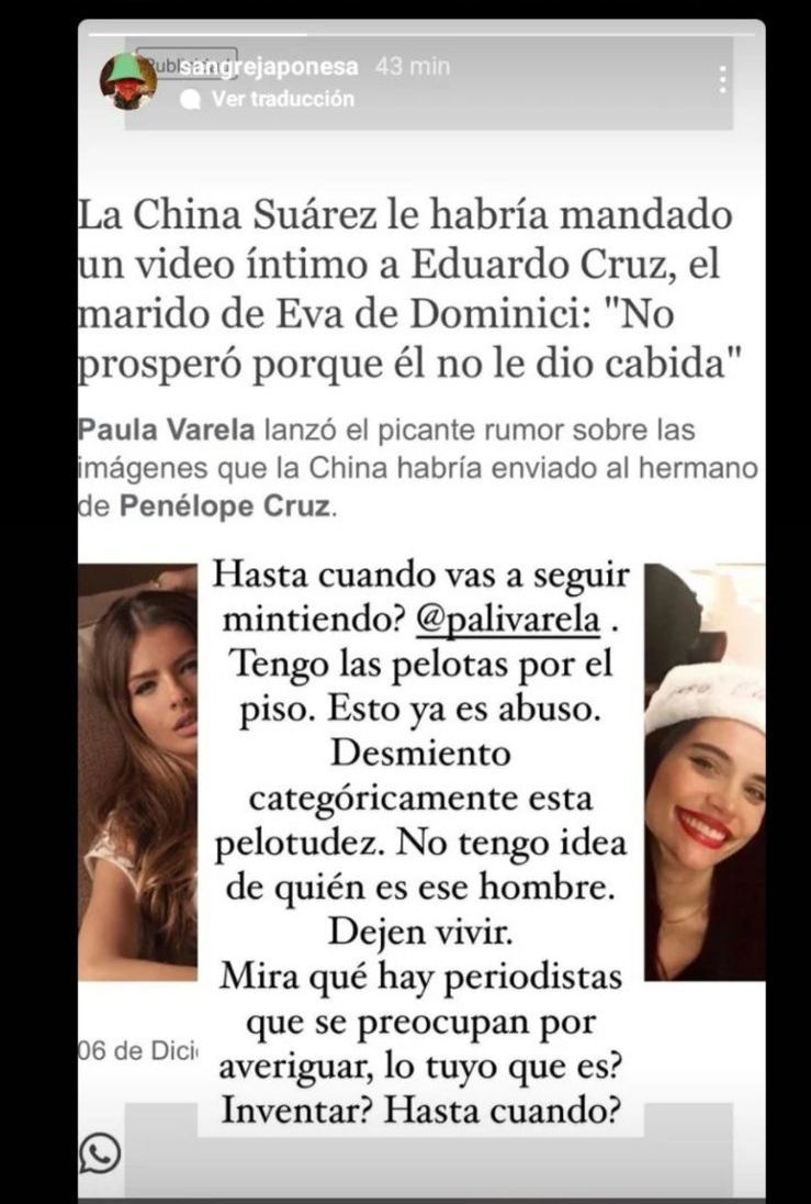 "Tengo la información de que la China estuvo mandando videos a varios y a no saben hasta donde llegó. Según me cuentan la China habría llegado hasta Eduardo Cruz, el hermano de Penélope Cruz y marido de nuestra querida Eva de Dominici, con quien tienen un hijo y viven en Los Ángeles”, dijo Varela.