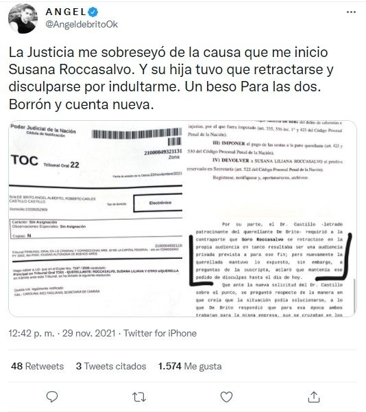Días atrás, Ángel de Brito compartió un mensaje en su cuenta de Twitter que generó un gran revuelo. "La justicia me sobreseyó de la causa que me inició Roccasalvo. Y su hija tuvo que disculparse por indultarme. Un beso para las dos. Borrón y cuenta nueva", redactó en la red social del pajarito y muchos salieron replicaron la información.
