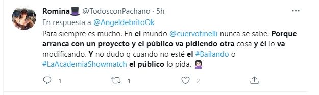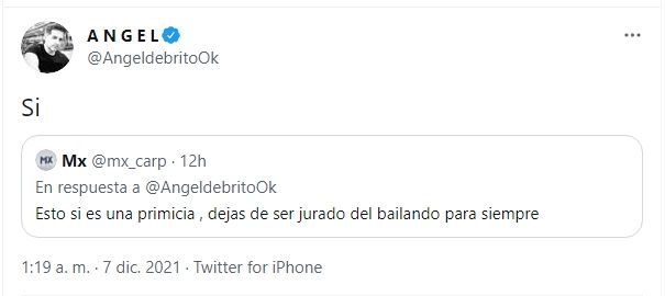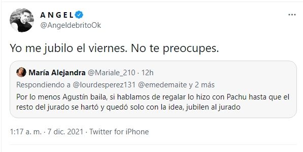 "Esto sí es una primicia, dejas de ser jurado del Bailando para siempre", a lo que Ángel de Brito se limitó a responder "Sí". Luego, una usuaria comentó: "Para siempre es mucho. En el mundo Tinelli nunca se sabe. Porque arranca con un proyecto y el público va pidiendo otra cosa y él lo va modificando. Y no dudo que cuando no esté el Bailando o La Academia, el público lo pida".