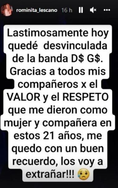 Horas más tarde, Romina volvió a utilizar las redes para poner sobre la mesa los motivos de su inesperada salida, apuntando directamente contra Pablo. "Hace 23 años aguantándote y porque sos mi hna. No te soporto más. Sos un dolor de (emojis de huevos). Y encima no sabes cantar. Devolveme los dos millones que perdiste", fueron algunas de las frases que resaltó Romina en referencia a los dichos del líder del grupo. Y agregó para cerrar: "Ni una humillación más, no me lo merezco. Hasta acá llegó mi amor".