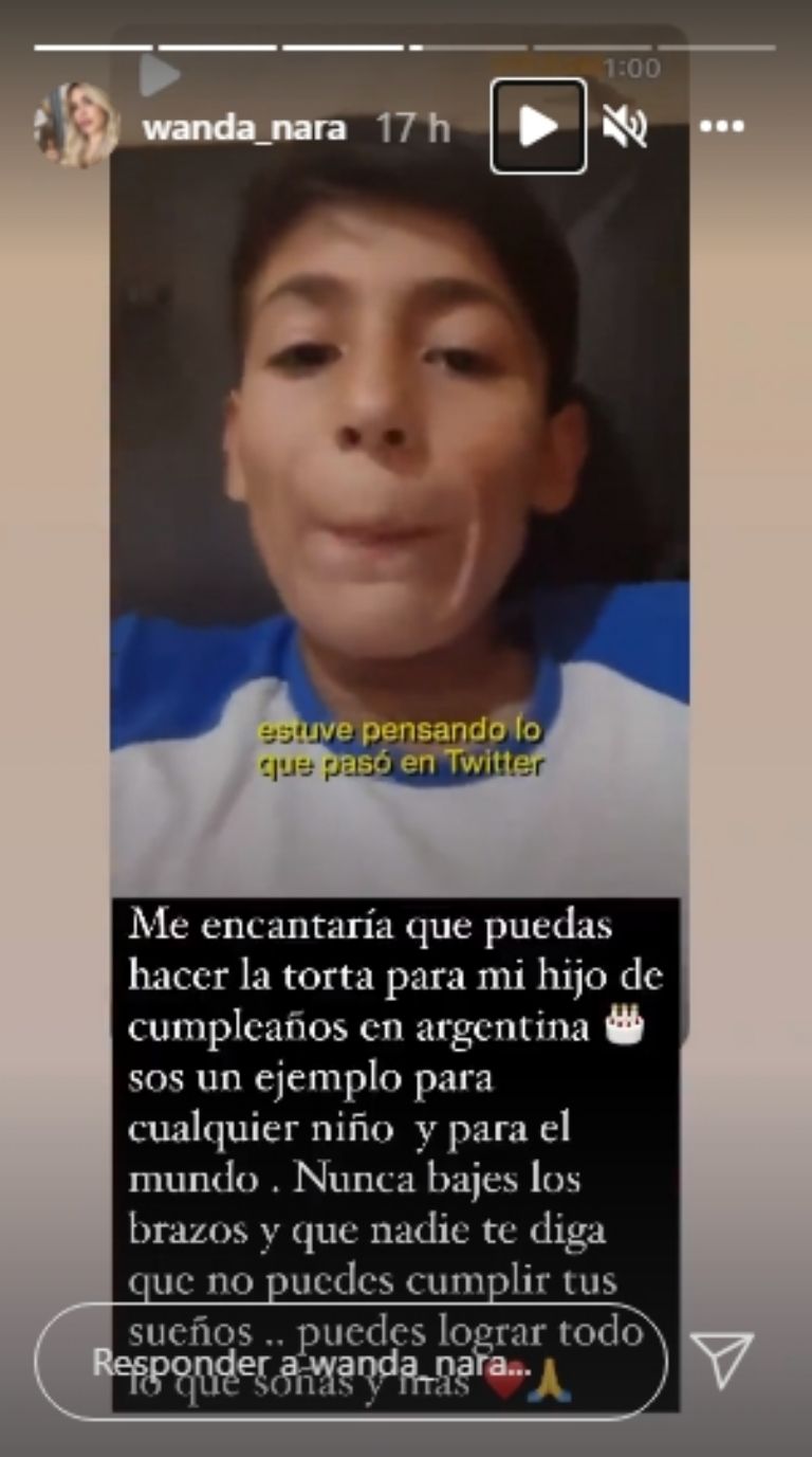En sus historias, Wanda compartió el video del niño con un emotivo mensaje. "Me encantaría que puedas hacer la torta para mi hijo de cumpleaños en Argentina. Sos un ejemplo para cualquier niño y para el mundo. Nunca bajes los brazos y que nadie te diga que no puedes cumplir tus sueños. Puedes lograr todo lo que soñás y más", comentó la empresaria.