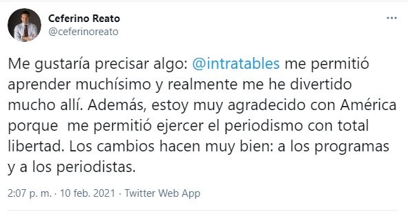 "Me gustaría precisar algo: Intratables me permitió aprender muchísimo y realmente me he divertido mucho allí. Además, estoy muy agradecido con América porque me permitió ejercer el periodismo con total libertad. Los cambios hacen muy bien: a los programas y a los periodistas", sostuvo para alejar cualquier tipo de rumor polémico sobre su desvinculación.