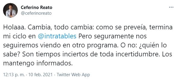 "Hola. Cambia, todo cambia: como se preveía, termina mi ciclo en Intratables. Pero seguramente nos seguiremos viendo en otro programa. O no: ¿quién lo sabe? Son tiempos inciertos de toda incertidumbre. Los mantengo informados", escribió el periodista Ceferino Reato en su cuenta de Twitter.