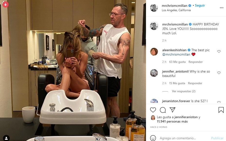 Una de las personas que la saludo en su perfil fue su estilista y amigo Chris McMillan que compartió una foto donde se lo ve junto a la protagonista de la película "Una esposa de mentira". Allí él la está peinando mientras Jennifer retrata ese momento frente a un espejo con una imagen. El famoso peluquero agregó el siguiente comentario: "HAPPY BIRTHDAY JEN. Love YOU!!!!! Sooooooooooooo much Lol".