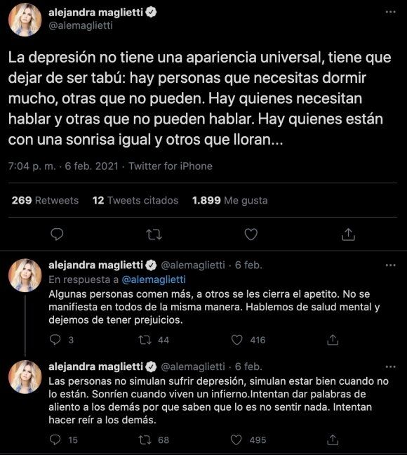 Alejandra Maglietti se expresó a través de Twitter, conmocionada por la noticia del suicidio del futbolista Santiago el "Morro" García. La panelista remarcó la importancia de poder hablar sin vergüenza sobre enfermedades como la depresión.