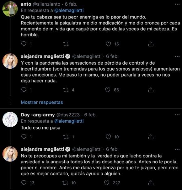 Finalmente, Alejandra se despidió revelando que sufre ansiedad y que los síntomas se intensificaron a partir de avance del coronavirus. "Y con la pandemia las sensaciones de pérdida de control y de incertidumbre (son tremendas para los que somos ansiosos) aumentaron. Me pasó lo mismo, no poder pararla a veces no nos deja hacer nada", expresó.