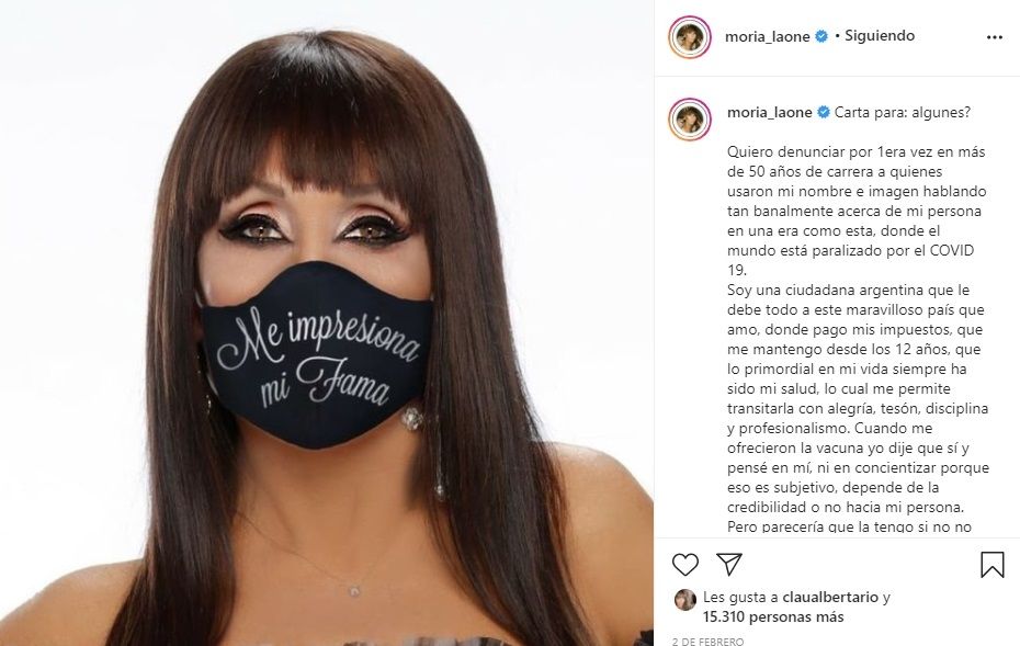 Algunos días atrás, fue Moria Casán quien realizó un contundente descargo sobre este asunto luego de que dijera que iba a recibir la vacuna. “Cuando me ofrecieron la vacuna yo dije que sí y pensé en mí, no en concientizar porque eso es subjetivo y depende de la credibilidad o no hacia mi persona”, expresó la diva.
