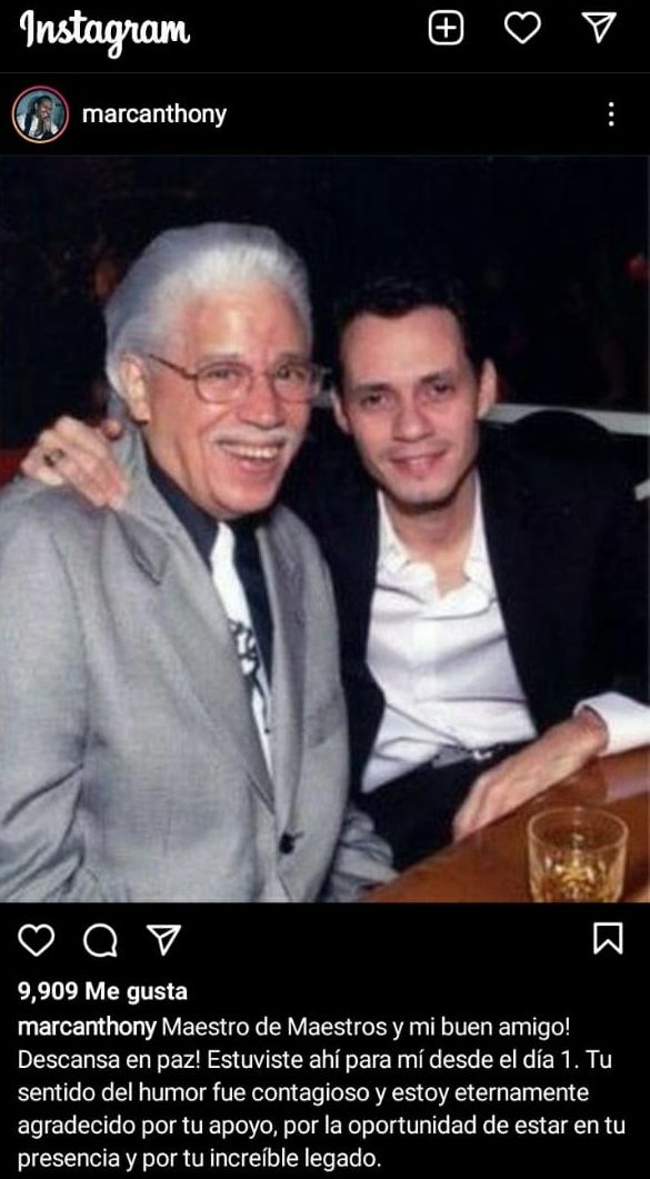 En tanto que el mensaje que publicó Marc Anthony en su cuenta oficial de Instagram hace algunos minutos atrás por la pérdida de Johnny Pacheco es el siguiente: "Maestro de Maestros y mi buen amigo ¡Descansa en paz! Estuviste ahí para mí desde el día 1. Tu sentido del humor fue contagioso y estoy eternamente agradecido por tu apoyo, por la oportunidad de estar en tu presencia y por tu increíble legado".