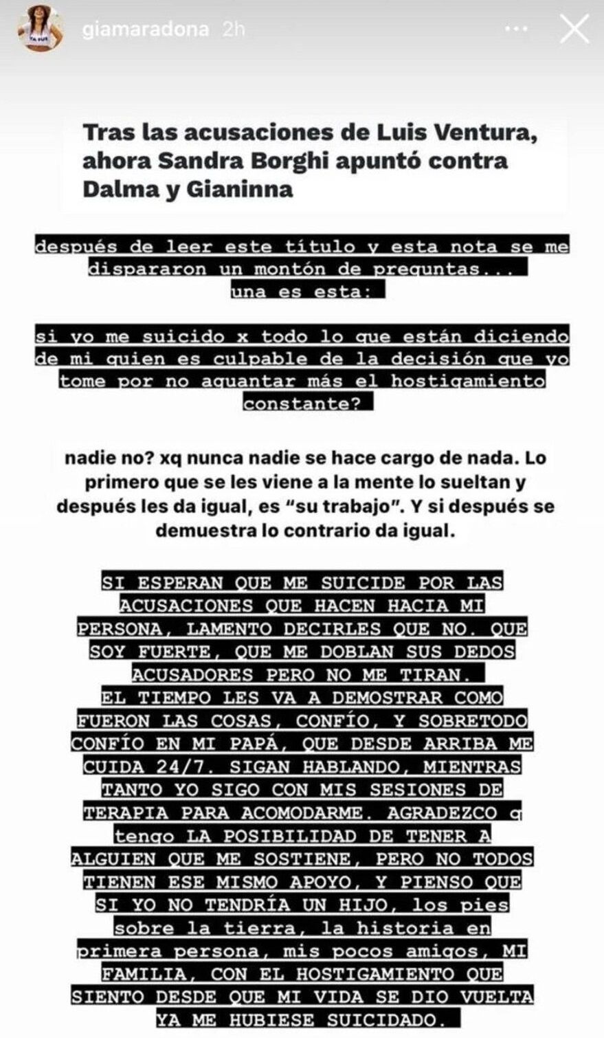 "Después de leer este título y esta nota, se me dispararon un montón de preguntas, una es esta: si yo me suicido por todo lo que están diciendo de mí, ¿quén es culpable de la decisión que yo tome por no aguantar más el hostigamiento constante? Nadie, ¿no? Porque nunca nadie se hace cargo de nada. Lo primero que se les viene a la mente lo sueltan y después les da igual, es ‘su trabajo'. Y si después se demuestra lo contrario da igual", redactó la hija menor de Claudia Villafañe y Diego.