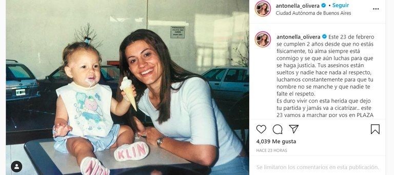 “Este 23 de febrero se cumplen 2 años desde que no estás físicamente, tu alma siempre está conmigo y sé que aún luchás para que se haga justicia. Tus asesinos están sueltos y nadie hace nada al respecto, luchamos constantemente para que tu nombre no se manche y que nadie te falte el respeto. TE AMO HOY Y SIEMPRE, donde quiera que estés jamás voy a dejar de luchar”, expresó la joven.