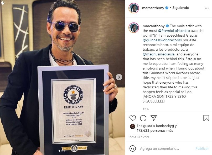 "The male artist with the most @PremioLoNuestro awards won?!?!?! I am speechless! Gracias @guinnessworldrecords por este reconocimiento, a mi equipo de trabajo, a los productores, a @magnusmediausa, and everyone that has been behind this. Esto sí no me lo esperaba. I am feeling so many emotions and when I found out about this Guinness World Records record title, my heart skipped a beat. I just hope that everyone who has dedicated their life to making this happen feels as special as I do. ¡AHORA SON TRES Y ESTO SIGUEEEEEEE!" (Textual).