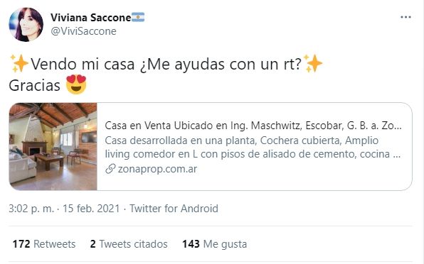 Viviana Saccone tomó la decisión de vender su casa y lo compartió con todos sus seguidores de Twitter. "Vendo mi casa, ¿me ayudás con un RT? Gracias", escribió. De inmediato consiguió cientos de retuits, de "Me gusta" y comentarios halagadores sobre su hogar.