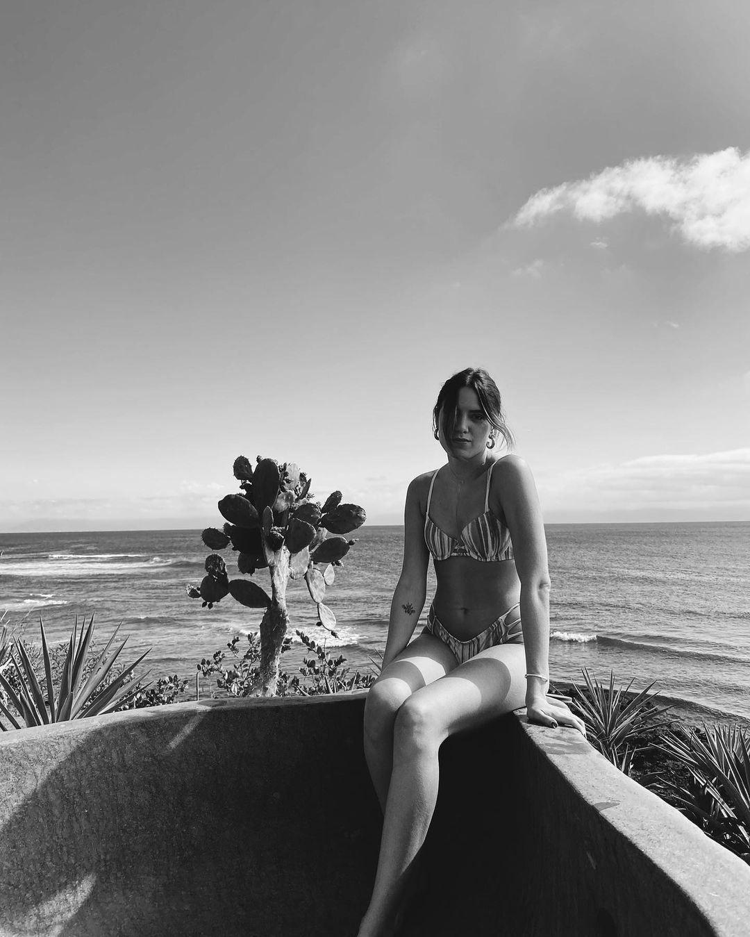 En el posteo se puede apreciar a América con una bikini estampada posando en la baranda de un balcón con el mar de fondo. La mencionada pic posee un filtro blanco y negro que resalta los bellos rasgos físicos de la nieta de Vicente Fernández.