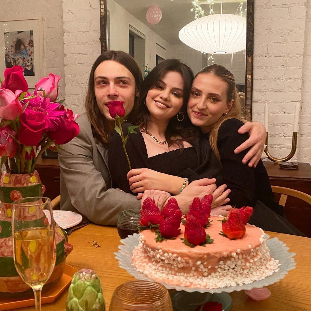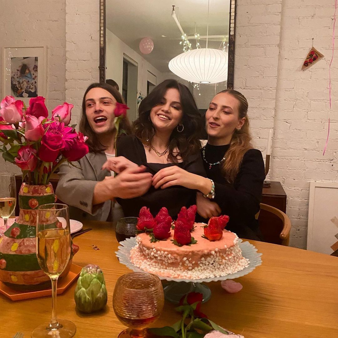 Selena que tiene 28 años de edad y una trayectoria indudable en el mundo del espectáculo, se dejó ver en las redes sociales acompañada por sus amigos compartiendo una mesa muy bien preparada. En la cena romántica atípica, donde son tres los comensales, se los vio muy sonrientes y disfrutando de unos manjares. Se pudo ver sobre la mesa una torta con frutillas, y copas de Champagne.