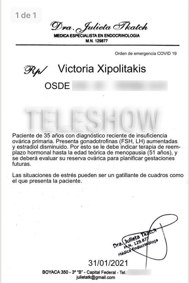 Yamil Castro Bianchi, abogado de la griega y quien lleva adelante la causa contra el ex marido de la mediática, confirmó en diálogo con Teleshow la veracidad del certificado con fecha 31 de enero, así como también la del informe médico firmado por la terapeuta que asegura que desde hace meses la ex vedette sufre "estrés emocional" y que además ella se preocupa por la revinculación de su hijo con su padre.