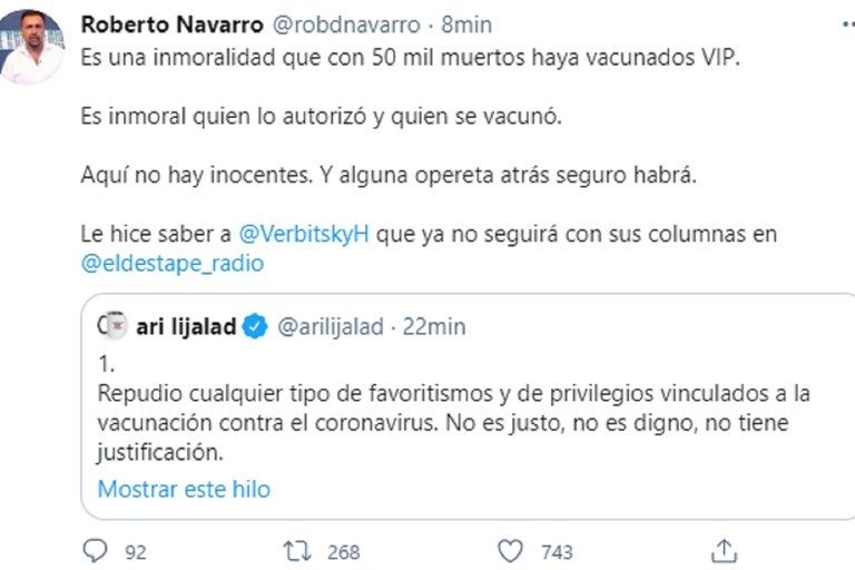 "Es una inmoralidad que con 50 mil muertos haya vacunados VIP. Es inmoral quien lo autorizó y quien se vacunó. Aquí no hay inocentes. Y alguna opereta atrás seguro habrá. Le hice saber a Horacio Verbitsky que ya no seguirá con sus columnas en El Destape radio", expresó fulminante Navarro en su cuenta de Twitter.