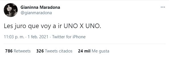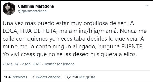 "Les juro que voy a ir uno por uno", publicó. "Una vez más puedo estar muy orgullosa de ser LA LOCA, HIJA DE PUTA, mala mina/hija/mamá. Nunca me calle con quienes yo necesitaba decirles lo que veía. A mi no me lo contó ningún allegado, ninguna FUENTE. Yo viví cosas que no se las deseo ni siquiera a ellos", puso además Gianinna esta madrugada en Twitter y dejó en claro su postura.