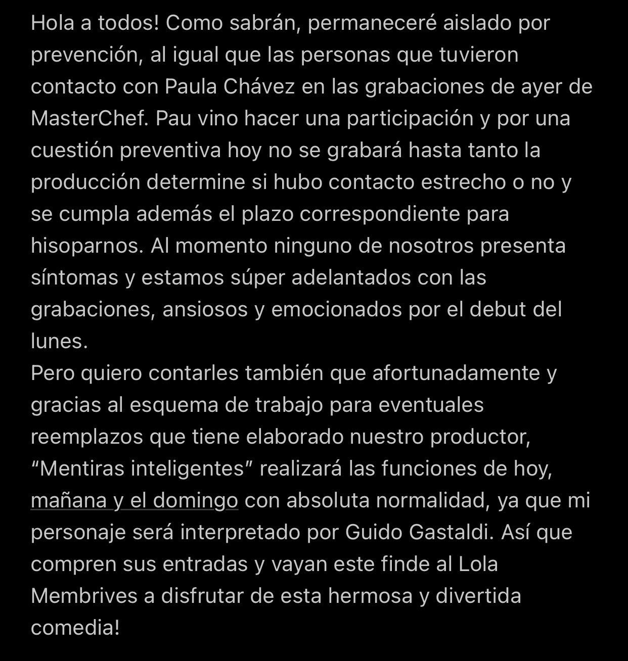 Al mismo tiempo y también en línea con el aislamiento preventivo, contó que este fin de semana no será parte de la funciones de Mentiras Inteligentes, la obra de teatro que protagoniza junto a Nora Cárpena, Arnaldo André y Micaela Vázquez: "Pero quiero contarles también que afortunadamente y gracias al esquema de trabajo para eventuales reemplazos que tiene elaborado nuestro productor, ‘Mentiras Inteligentes’ realizará las funciones de hoy, mañana y el domingo con absoluta normalidad, ya que mi personaje será interpretado por Guido Gastaldi".