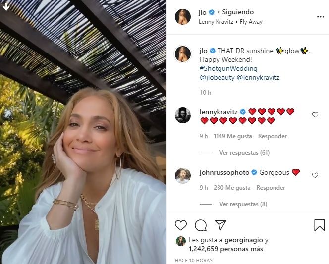 A ese momento que fue retratado en su cuenta oficial de Instagram, la ex de Marc Anthony le agregó el siguiente comentario: "THAT DR sunshine ✨glow✨. Happy Weekend! #ShotgunWedding @jlobeauty @lennykravitz". Por lo que el famoso cantante Lenny Kravitz que le contestó con varios: "❤️❤️❤️❤️❤️❤️❤️❤️❤️❤️❤️❤️❤️".
