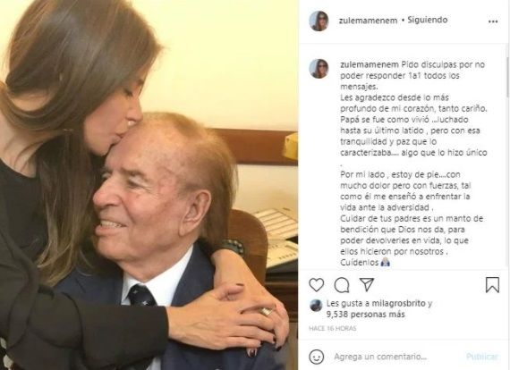 Ahora, a una semana de su fallecimiento, Zulemita Menem -su hija- le dedico una emotiva publicación en su cuenta de Instagram. "Pido disculpas por no poder responder 1 a 1 todos los mensajes. Les agradezco desde lo más profundo de mi corazón, tanto cariño", comenzó su texto.