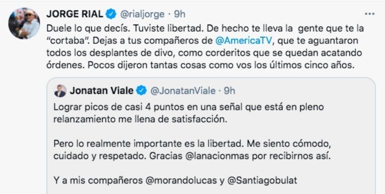 Pero Viale desató polémica con los compañeros de su canal anterior (América), ya que en su cuenta de Twitter destacó que en la señal de La Nación puede trabajar en "libertad" y que se siente "cómodo, cuidado y respetado".