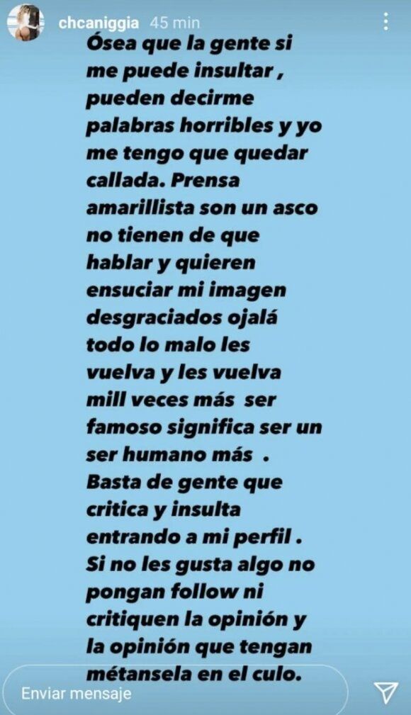 Y se despidió redoblando la apuesta, mostrándose súper contundente contra los haters: "Ser famoso significa ser un ser humano más. Basta de gente que critica e insulta entrando a mi perfil. Si no les gusta algo no pongan follow, ni critiquen la opinión... La opinión métansela en el cul...".