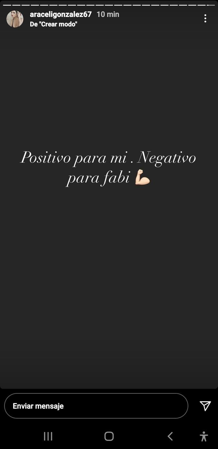 Finalmente, al igual que en tantos casos de parejas o familias en las que algunos se contagian y otros no, la exmodelo anunció que el hisopado de su pareja, Fabián Mazzei dio negativo. "Positivo para mí, negativo para Fabi", escribió Araceli. Luego agregó: "Qué locura es naturalizar algo que de verdad es muy triste".